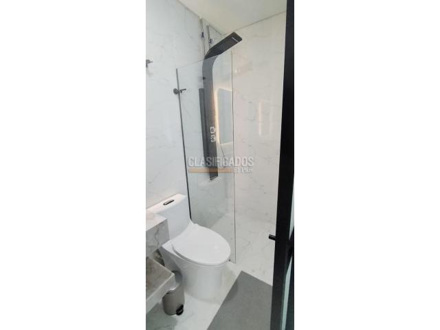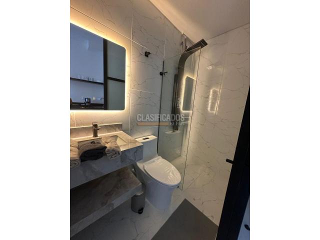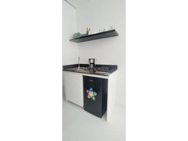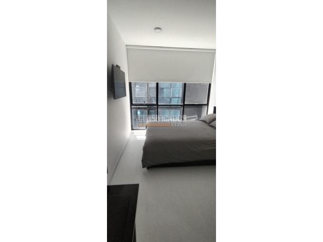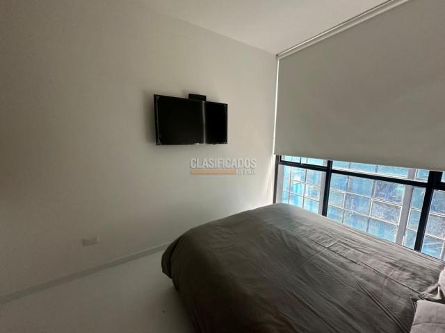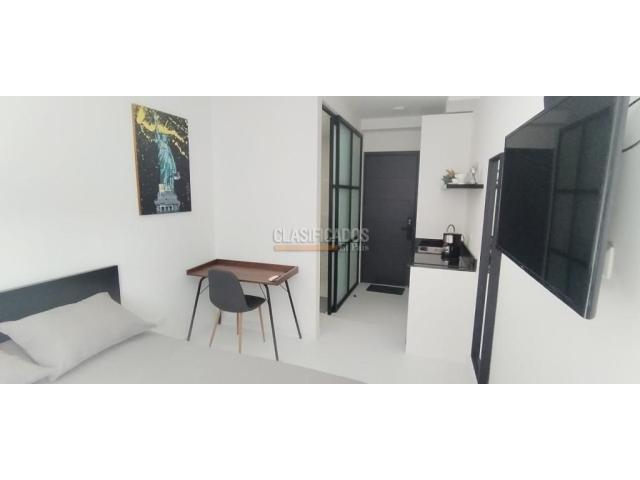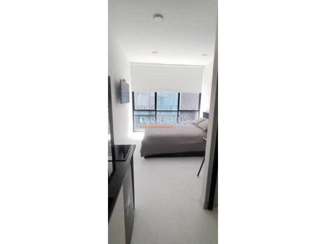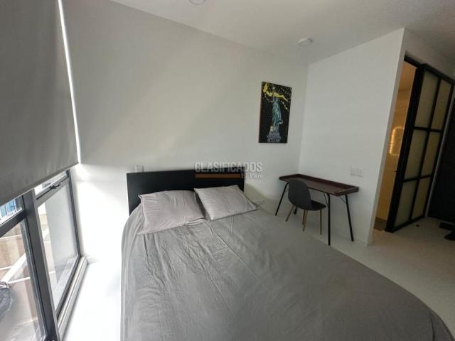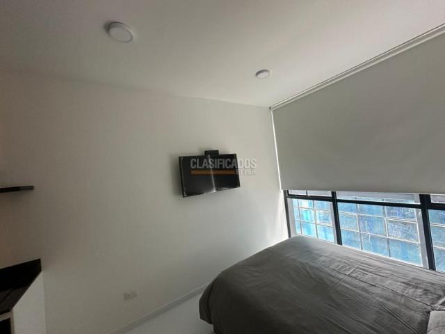 Código del inmueble 120441 Se Arrienda Hermoso Apartaestudio Amoblado, Cuenta con cama Doble, (Direct TV), cortinas Blackout , cocina integral, cafetera, cuenta con menaje, escritorio, espejo Deluxe tipo loft, baño con división de vidrio, acabados de lujo, Pisos laminados, Cerrojo de seguridad que puedes abrir con huella, clave, llave o tarjeta, ascensor, vista exterior, Área comunal del inmueble Coworking. No esperes más; haz de este lugar tu hogar. Código interno: A120441