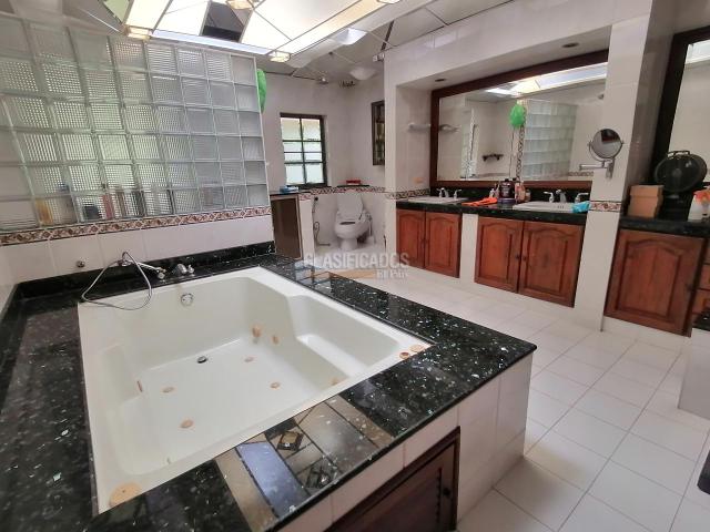Casa lote independiente en Pance de 2 pisos, sector La Viga, de 3.743 m2, con una casa de 923 m2, estato 6, uso de suelo mixto, lote con hermosos jardines, frutales (mangos, pana, mangostino, carambolo, etc.), riachuelo, pozo, cerramiento en muro, malla, swingla, cancha de futbol, casa para casero, planta electrica, motobomba, parqueadero cubierto para 4 carros y descubierto para 11 mas, terminados en madera fina en perfecto estado. Excelente ubicacion con ingreso por la recta Cali - Jamundi o por la Av. Cañas gordas, cerca a la iglesia La Maria, colegio Montessori, Universidades Icesi y Javeriana, Price Smart, eco parque Las Garzas. Piso 1: Dos salas, comedor, gran terraza con sala de star y comedor con hermosa vista a zona verde,zona BBQ, 3 habitaciones, baño de alcobas, cuarto de servicio con baño, estudio, amplia cocina con gas domiciliario y otro comedor, sala de tv. Piso 2: Holl de alcobas, 4 grandes habitaciones cada una con baño y vestier, la ppal con jacuzzi. Unico dueño