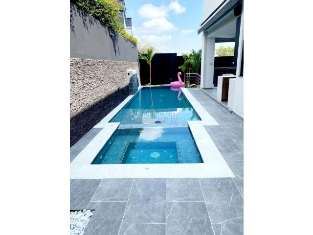 Descubre el lujo y la exclusividad Esta espectacular casa, lista para estrenar y próxima a entrega, se ubica en el sector más exclusivo de la ciudad, con una vista panorámica inigualable. Con 550 metros cuadrados construidos sobre un lote de 800 metros, esta casa ofrece amplios espacios para compartir momentos inolvidables con tus seres queridos. parqueadero cubierto para cuatro vehículos, sala de recibo con doble altura y ventanales de piso a techo, una cocina full equipada con mesón en piedra sin terizado,disfruta de sala de cine, terraza piscina privada jacuzzi, baño turco y una acogedora sala con fogata. En el segundo nivel, encontrarás un estudio y cuatro habitaciones, cada una con balcón, baño privado y vestier. La terraza, perfecta para el entretenimiento, incluye una zona de BBQ y un bar con vista panorámica a la ciudad. Ubicada cerca de los mejores colegios y universidades agenda tu visita y ven a conocer tu nuevo hogar