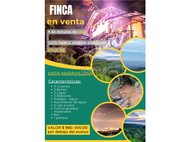 ubicado en un lugar tranquilo de alta valorización con mucho avistamiento de aves y animales de los farallones de Cali, una gran vista del valle y del nevado del Huila, tiene dos nacimientos de aguas, con quebrada y cerca un rio, lagos, con buena cantidad de agua si desea construir, las habitaciones tiene closet se entregaran con sus camas, la cocina también se entregara con algunos unten-cilios, cuenta con galpón, la propiedad se vende a menor valor del evaluó, propiedad cuenta con escrituras