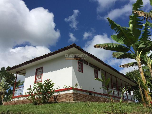 Venta de finca en Montenegro Quindío - Santa Teresita , 29 cuadras + 5.483 M2, sembrada en plátano hartón, cuenta con cultivo de naranja swetty y plátano en plena producción, la casa principal es de un piso y cuenta con sala comedor, amplios pasillos, 3 amplios cuartos y 3 baños, cocina integral, zona de oficios, patio, cuenta con linda vista, adicionalmente esta la casa del mayordomo de 2 pisos con todo lo pertinente para su comodidad, casa viviente, hermosa quebrada, nacimiento de agua, guaduales, hermosos jardines y diversidad de vegetación, senderos, clima templado y cerca a vía principal. ... - Código 4012921
